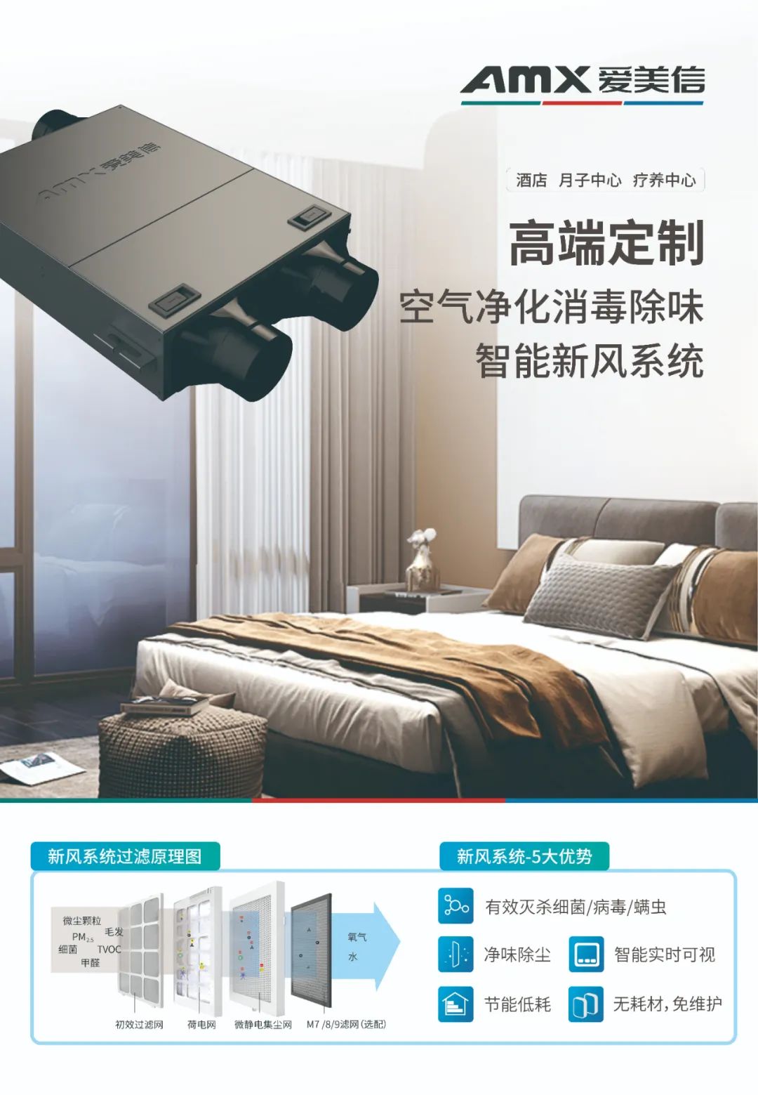 2.離子殺菌凈化新風(fēng)系統(tǒng),通過(guò)采取等離子殺菌、微靜電集成技術(shù),為酒店房間、月子中心、高級(jí)病房打造無(wú)菌、無(wú)塵、富氧舒適睡眠休養(yǎng)空間。